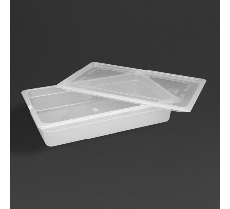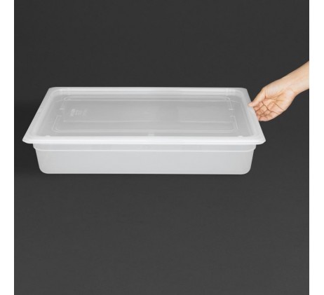 Bacs en polypropylène GN 1/1 fournis avec couvercles étanches pour conserver la fraîcheur des aliments stockés. Empilables pour une solution gain de place. Solution idéale pour la préparation d'aliments chauds ou froids en cuisine. Compatibles congélateur. Plage de température -40° C à 70° C.