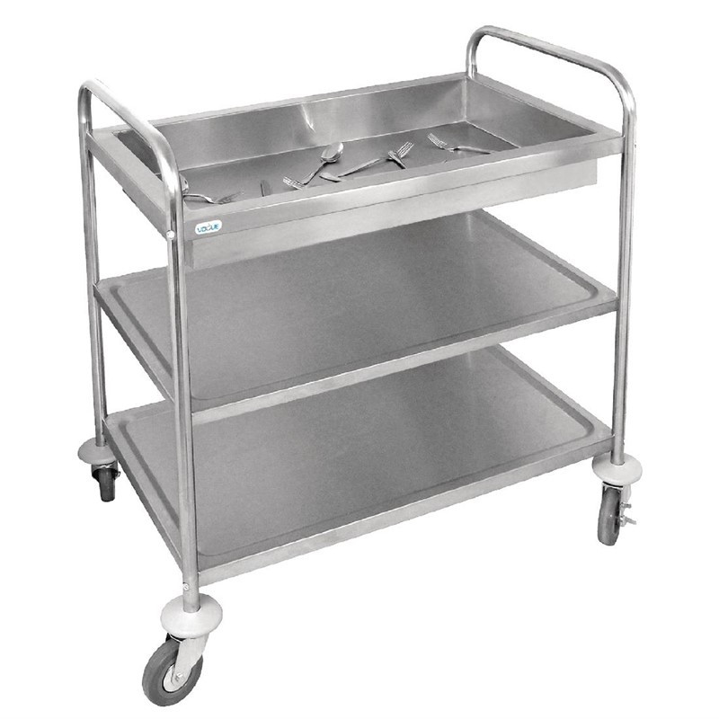 Accélérez vos temps de débarrassage avec ce grand chariot Vogue. Doté de trois étagères spacieuses, incluant un plateau supérieur de 100mm de profondeur pour collecter les couverts, c'est un excellent moyen de nettoyer rapidement et efficacement ; ces équipements plus rapides sont garantis pour rendre chaque service un peu plus fluide.