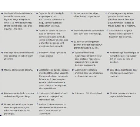 Type de machine Puissance de raccordement | Coupe légumes 0.75 Kw |