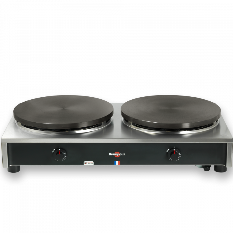 Elle est équipée de deux plaques en fonte usinée qui permettent de tourner les crêpes et de les garnir sur un seul appareil. Ses plaques sont dotées de picots, permettant de capter la chaleur pour en assurer une excellente transmission et répartition. Les manettes de contrôle graduées, développées sur mesure pour être plus robustes et plus résistantes à l’arrachement, permettent un réglage précis de la température. Très résistante, la fonte brute usinée ne craint pas les chocs.