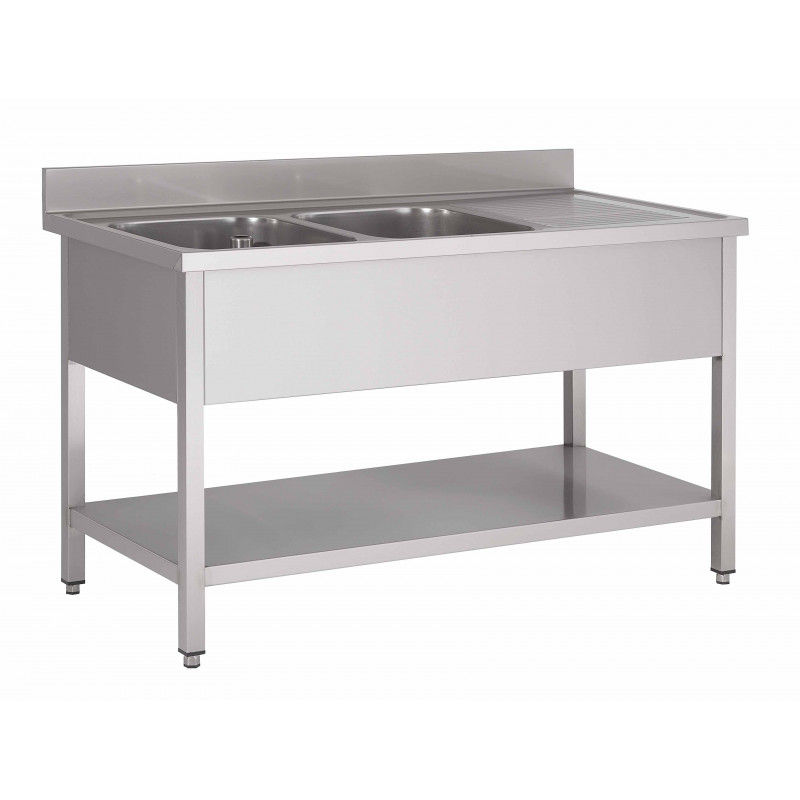 Plonges standards en inox AISI 430 de 1 mm d’épaisseur avec un ou deux bacs et un ou deux égouttoirs selon le modèle. Piétement en tubes carrés de 40 mm avec bandeau avant et latéral en inox AISI 430 de 0,8 mm d’épaisseur de 300 mm de hauteur. La tablette inférieure est en inox de 0.8 mm d’épaisseur avec des bords tombants de 40 mm et retours de 15 mm, renforcée par un oméga en inox. Les plonges sont fournies avec bondes et crépines mais sans trou pour robinet.