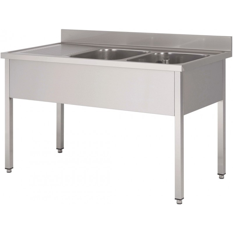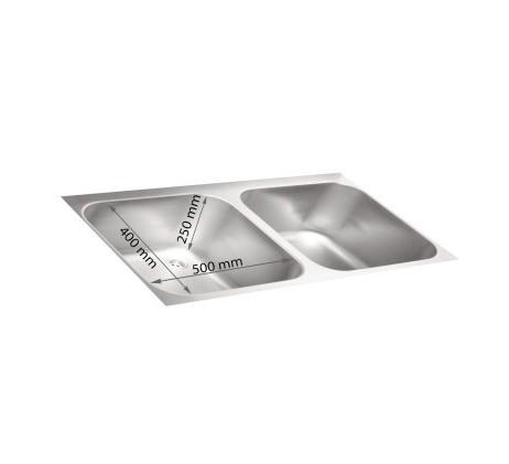 Plonges standards en inox AISI 430 de 1 mm d’épaisseur avec un ou deux bacs et un ou deux égouttoirs selon le modèle. Piétement en tubes carrés de 40 mm avec bandeau avant et latéral en inox AISI 430 de 0,8 mm d’épaisseur de 300 mm de hauteur. La tablette inférieure est en inox de 0.8 mm d’épaisseur avec des bords tombants de 40 mm et retours de 15 mm, renforcée par un oméga en inox. Les plonges sont fournies avec bondes et crépines mais sans trou pour robinet.