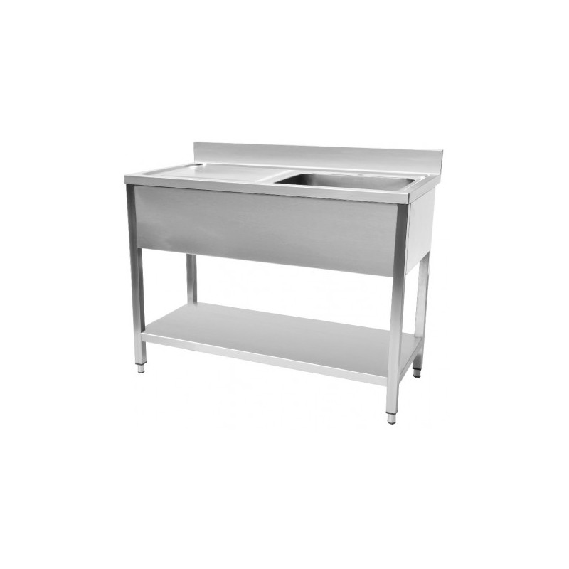 Plonges standards en inox AISI 430 de 1 mm d’épaisseur avec un ou deux bacs et un ou deux égouttoirs selon le modèle. Piétement en tubes carrés de 40 mm avec bandeau avant et latéral en inox AISI 430 de 0,8 mm d’épaisseur de 300 mm de hauteur. La tablette inférieure est en inox de 0.8 mm d’épaisseur avec des bords tombants de 40 mm et retours de 15 mm, renforcée par un oméga en inox. Les plonges sont fournies avec bondes et crépines mais sans trou pour robinet.