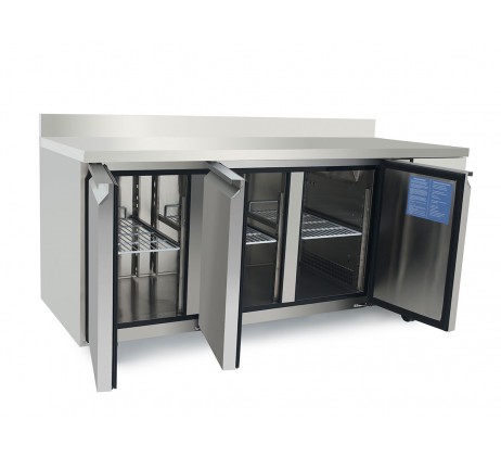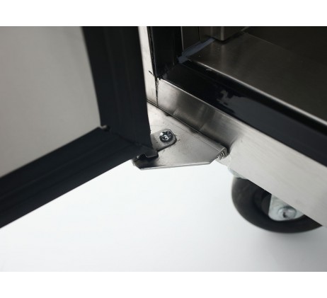 Structure intérieure et extérieure en acier inoxydable, plan de travail AISI 304 (arrière et dessous en galva) • Compresseur Embraco • Thermostat numérique Dixell / Carel • Froid ventilé • Évaporateur traité cataphorèse • Grilles sur glissières • Roues de série avec freins en façade • Dégivrage automatique • Angles intérieurs arrondis • Fermeture de porte par rappel automatique • Maintient de porte en position ouverte à 90° • Joints de porte magnétiques (faciles à nettoyer et démontables sans outils) • Isolation enceinte : 60 mm • Alimentation électrique 220V – 50 Hz