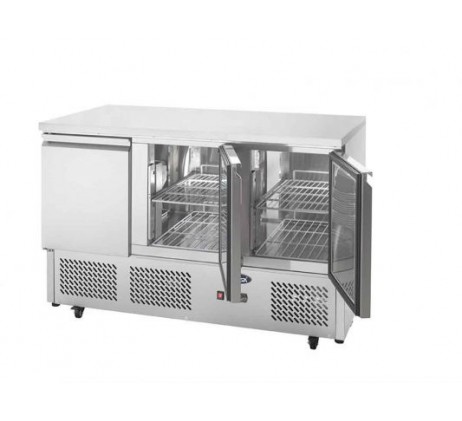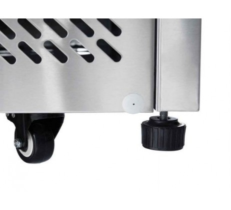 • Structure intérieure et extérieure en acier inoxydable (arrière et dessous en galva) • Thermostat numérique Dixell / Carel • Froid par serpentin moulé dans l’enceinte • Brassage de l’air avec un ventilateur au centre du meuble • Grilles sur glissières • Pieds et roulettes de série • Serrure pour accès facile au filtre du condenseur • Dégivrage automatique • Angles intérieurs arrondis • Fermeture de porte par rappel automatique • Maintient de porte en position ouverte à 90° • Joints de porte magnétiques (faciles à nettoyer et démontables sans outils) • Isolation enceinte : 35 mm • Alimentation électrique 220V – 50 Hz
