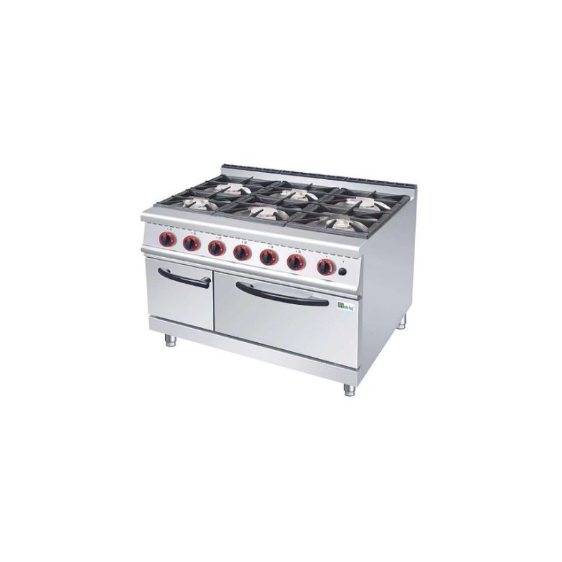 Découvrez le fourneau gaz professionnel 6 feux sur four gaz de la Gamme 700 signé AFI COLLIN LUCY, spécialement conçu pour répondre aux besoins des restaurateurs et des cuisines professionnelles à forte activité. Équipé de six brûleurs puissants (3 x 3,5 kW et 3 x 4,5 kW), ce fourneau garantit une cuisson rapide, homogène et parfaitement maîtrisée grâce à ses veilleuses et son allumage Piezo sécurisé. Son four statique gaz offre une large plage de températures (120°C à 300°C), idéal pour rôtir, gratiner ou cuire à basse température, avec une puissance de 5,8 kW et une grille spacieuse de 579,5 x 540 mm. La conception tout inox assure durabilité, hygiène et entretien facile, tandis que les cuvettes amovibles et les repose-casseroles en fonte garantissent un nettoyage simplifié et une excellente stabilité des ustensiles. Ses pieds réglables permettent une parfaite adaptation à votre espace de travail. Ce fourneau est un choix optimal pour les cuisines professionnelles recherchant performance, fiabilité et robustesse pour un usage quotidien intensif.