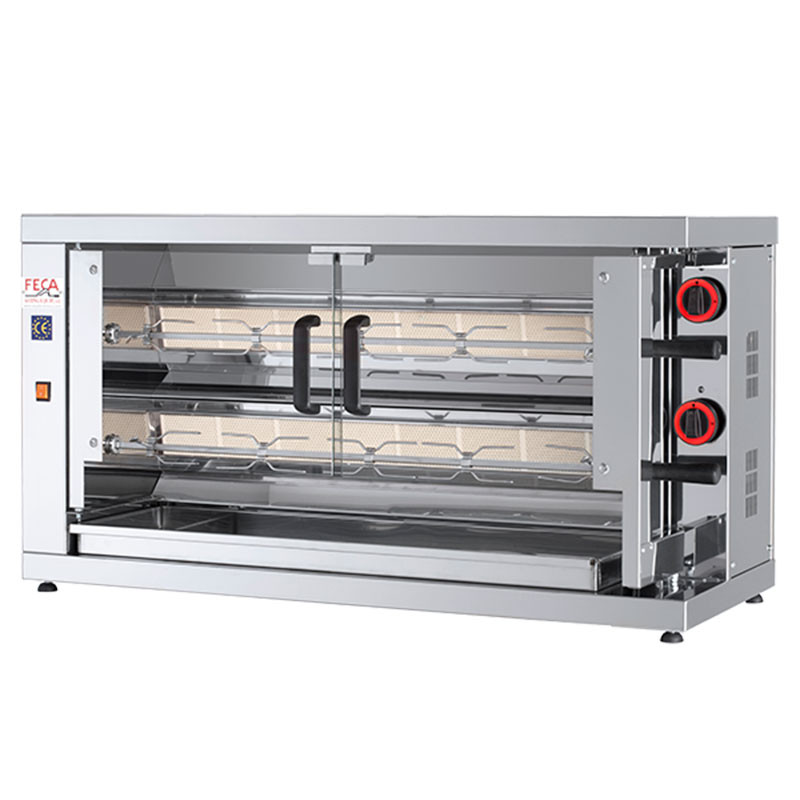 Les plaques entre les brûleurs sont extractibles pour un nettoyage facile. Cette rôtissoire 12 poulets (le nombre de poulets est donné à titre indicatif, car le nombre dépendra du poids des poulets et du système de montage sur la broche), est équipée de 3 pics centrales et 2 pics sur le côté par broche. Les commandes frontales sont faciles d'accès et les supports de broche permettent de mieux fermer la porte, pour une meilleure rétention de la chaleur.