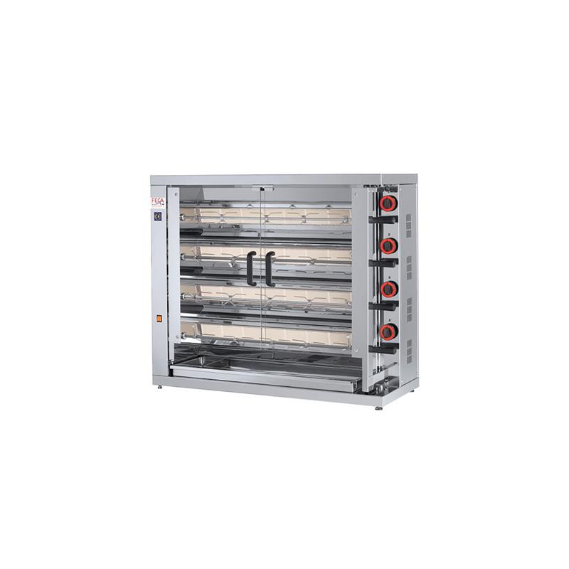 Les plaques entre les brûleurs sont extractibles pour un nettoyage facile. Cette rôtissoire 20/24 poulets (le nombre de poulets est donné à titre indicatif, car le nombre dépendra du poids des poulets et du système de montage sur la broche), est équipée de 3 pics centrales et 2 pics sur le côté par broche. Les commandes frontales sont faciles d'accès et les supports de broche permettent de mieux fermer la porte, pour une meilleure rétention de la chaleur.