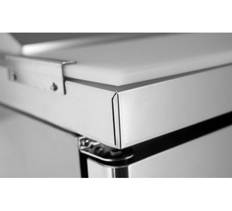 • Structure intérieure et extérieure en acier inoxydable (arrière et dessous en galva) • Planche de découpe en polypropylène blanc démontable • Compresseur Embraco • Froid ventilé • Évaporateur traité cataphorèse • Grilles sur taquets (4 taquets par grilles) • Roues de série avec freins en façade • Compartiments pour bacs GN • Couvercles démontables • Poignées encastrées • Dégivrage automatique • Angles intérieurs arrondis • Fermeture de porte par rappel automatique • Maintient de porte en position ouverte à 90° • Joints de porte magnétiques (faciles à nettoyer et démontables sans outils) • Isolation enceinte : 45 mm • Alimentation électrique 220V – 50 Hz