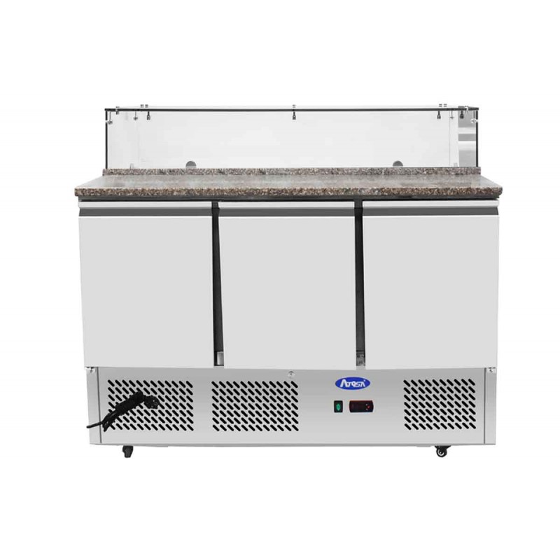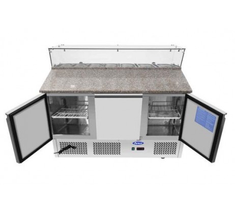 • Structure intérieure et extérieure en acier inoxydable (arrière et dessous en galva) • Thermostat numérique Dixell / Carel • Froid par serpentin moulé dans l’enceinte • Brassage de l’air avec un ventilateur au centre du meuble • Grilles sur glissières • Plan de travail en granit (Profondeur 360 mm) • Pare haleine droit en verre • Pieds et roulettes de série • Serrure pour accès facile au filtre du condenseur • Dégivrage automatique • Angles intérieurs arrondis • Fermeture de porte par rappel automatique • Maintient de porte en position ouverte à 90° • Joints de porte magnétiques (faciles à nettoyer et démontables sans outils) • Isolation enceinte : 35 mm • Alimentation électrique 220V – 50 Hz