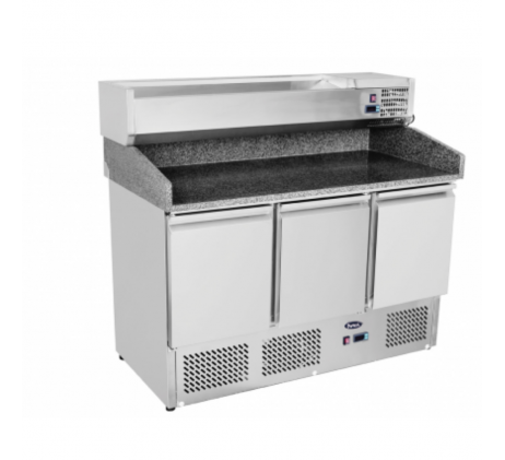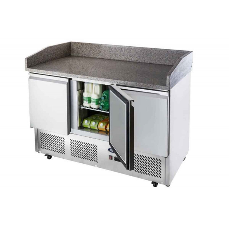 Structure intérieure et extérieure en acier inoxydable (arrière et dessous en galva) • Plan de travail en granit • Thermostat numérique Dixell / Carel • Froid par serpentin moulé dans l’enceinte • Brassage de l’air avec un ventilateur au centre du meuble • Glissières • Pieds et roulettes de série • Serrure pour accès facile au filtre du condenseur • Dégivrage automatique • Angles intérieurs arrondis • Fermeture de porte par rappel automatique • Maintient de porte en position ouverte à 90° • Joints de porte magnétiques (faciles à nettoyer et démontables sans outils) • Isolation enceinte : 35 mm • Alimentation électrique 220V – 50 Hz