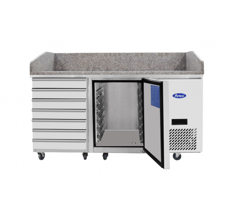 Structure intérieure et extérieure en acier inoxydable (arrière et dessous en galva) • Plan de travail en granit • Compresseur Embraco • Thermostat numérique Dixell / Carel • Froid ventilé • Évaporateur traité cataphorèse • Glissières • Roues de série avec freins en façade • Dégivrage automatique • Angles intérieurs arrondis • Fermeture de porte par rappel automatique • Maintient de porte en position ouverte à 90° • Joints de porte magnétiques (faciles à nettoyer et démontables sans outils) • Isolation enceinte : 60 mm • Alimentation électrique 220V – 50 Hz