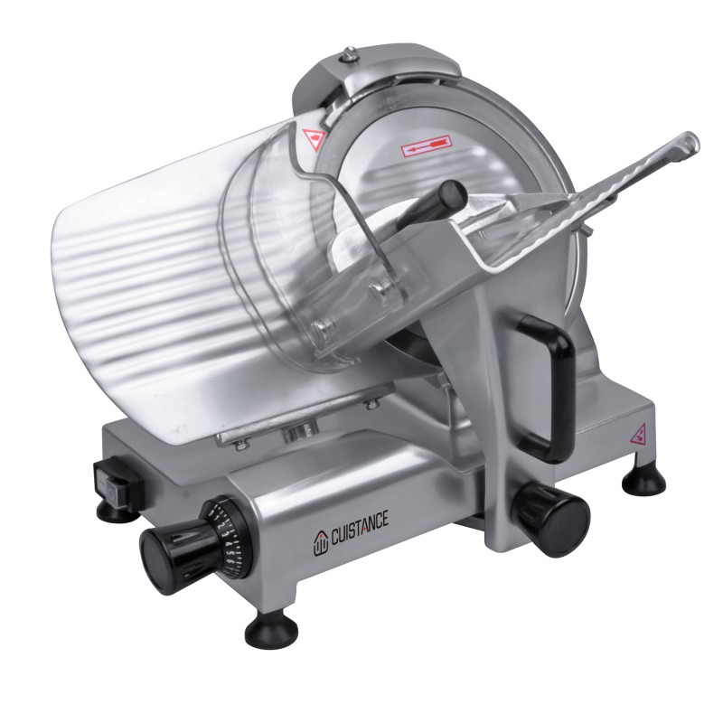 Trancheur en aluminium anodisé de la marque CUISTANCE permettant de réaliser des découpes de la charcuterie et aliment moelleux aux plus compacts.