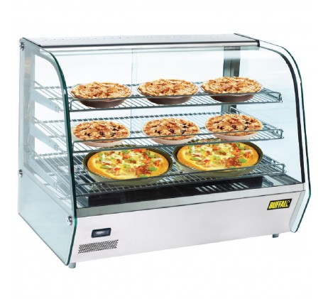 Vitrine à quatre côtés en verre pour maintenir les aliments préparés au chaud. 3 étagères en chrome fixes pour présenter tartes, pâtisseries et autres en-cas. Température réglable de 30 à 90°C, façade en verre incurvée pour présenter un maximum de produits et portes arrière coulissantes pour un accès facile. Possède un éclairage interne à LED.